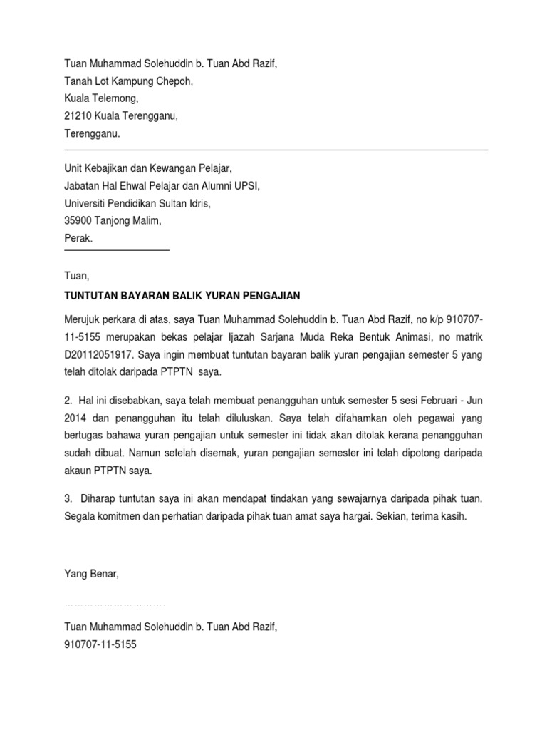 Surat Tuntutan Bayaran Balik